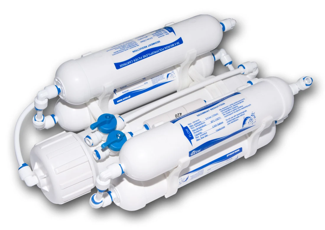Kompletny system uzdatniający wodę metodą odwróconej osmozy do celów akwarystycznych. W stosunku to prostych konstrukcji spotykanych na rynku, filtr posiada rozbudowaną filtrację wstępną z zabezpieczeniem membrany przed pyłem węglowym.