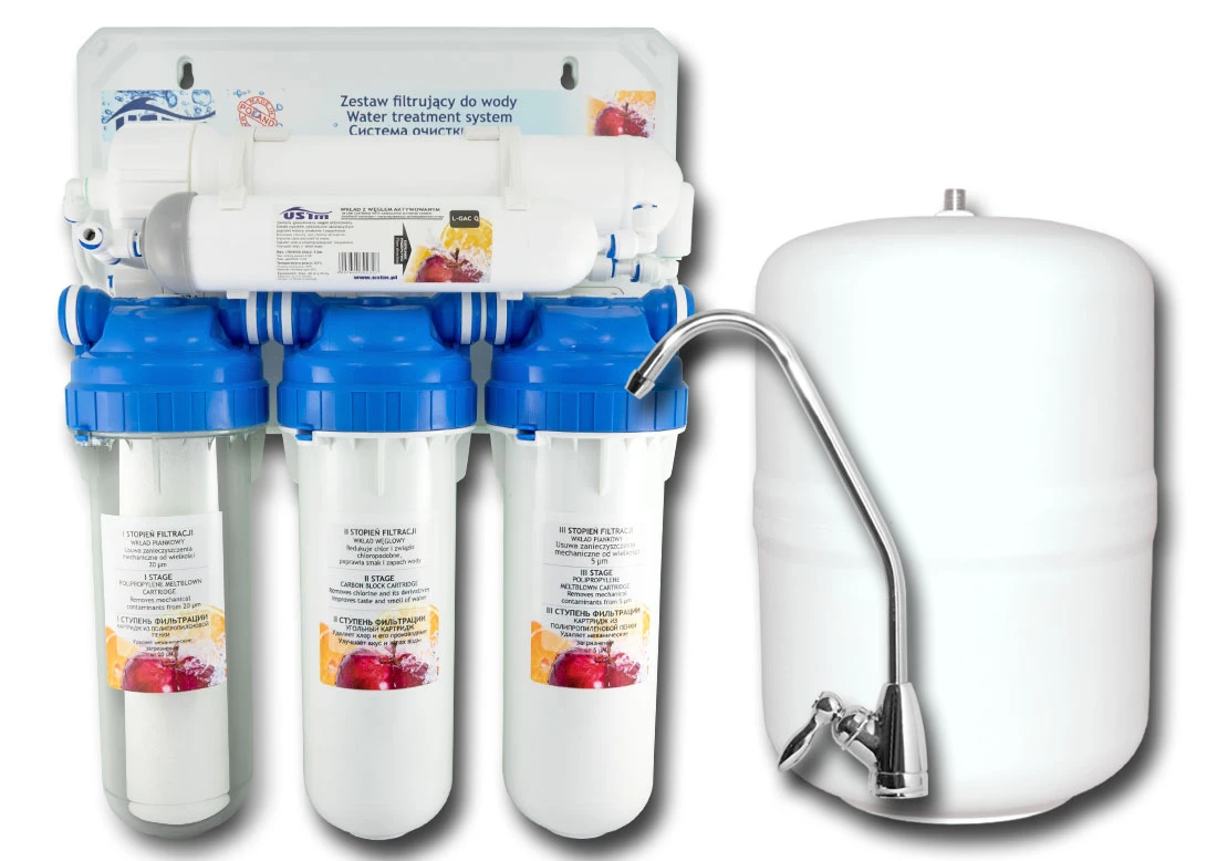 Kompletny system uzdatniający wodę metodą odwróconej osmozy RO5. Filtr zapewniający czystą wodę, bez osadzania się zawiesin i kamienia, bez brunatnych i białych zacieków - wodę idealną do przygotowywania kawy, herbaty itd.