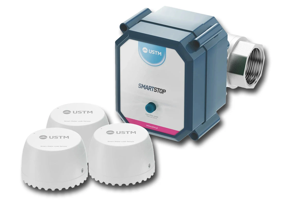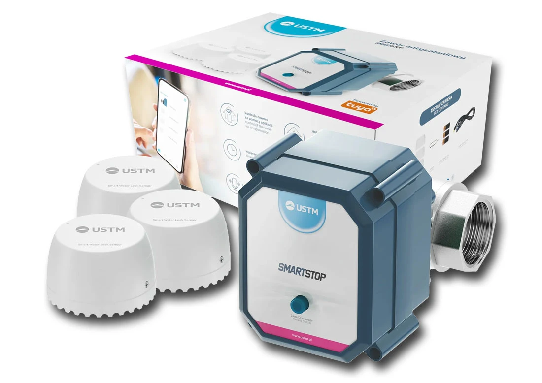 Zawór antyzalaniowy USTM SmartStop z funkcją zdalnego sterowania aplikacją Tuya Smart przy pomocy smartfona (aplikacja dostępna bezpłatnie na platformy Android i iOS). Najlepsze zabezpieczenie przed zalaniem dowolnego lokalu (dom, firma, mieszkanie itd.) w przypadku gdy wystąpi awaria instalacji wodnej. Zawór komunikuje się z trzema czujnikami, wykorzystując do tego sieć bezprzewodową (WiFi).